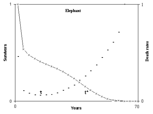 survival curve of natural populations reported by [Beverton & Holt 1959;Laws 1966, 1968;Laws & Parker 1968; Deevey 1947; Spinage 1970, 1972].