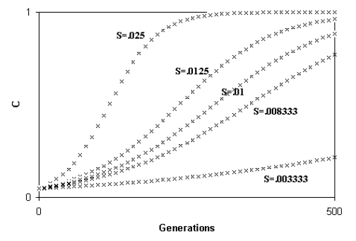 number of individuals, of a gene C with advantage S according to the variation of the value