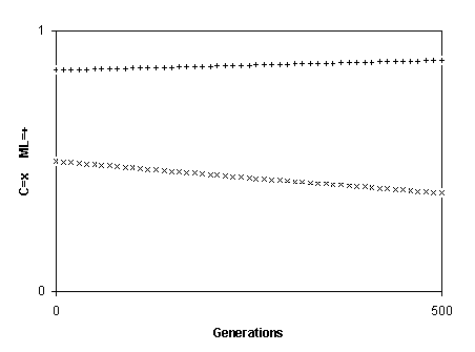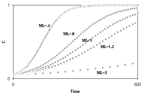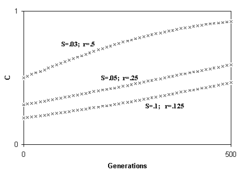 Fig. 2. Spreading of a gene (C) according to the variation of S (while ML = k).